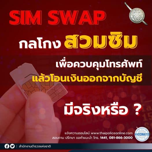 #ให้ความรู้ “กลโกงสวมซิม (SIM SWAP) เพื่อควบคุมโทรศัพท์แล้วโอนเงินออกจากบัญชี มีจริงหรือ ” (อ่านรายละเอียดที่เพจสำนักงานตำรวจแห่งชาติ)