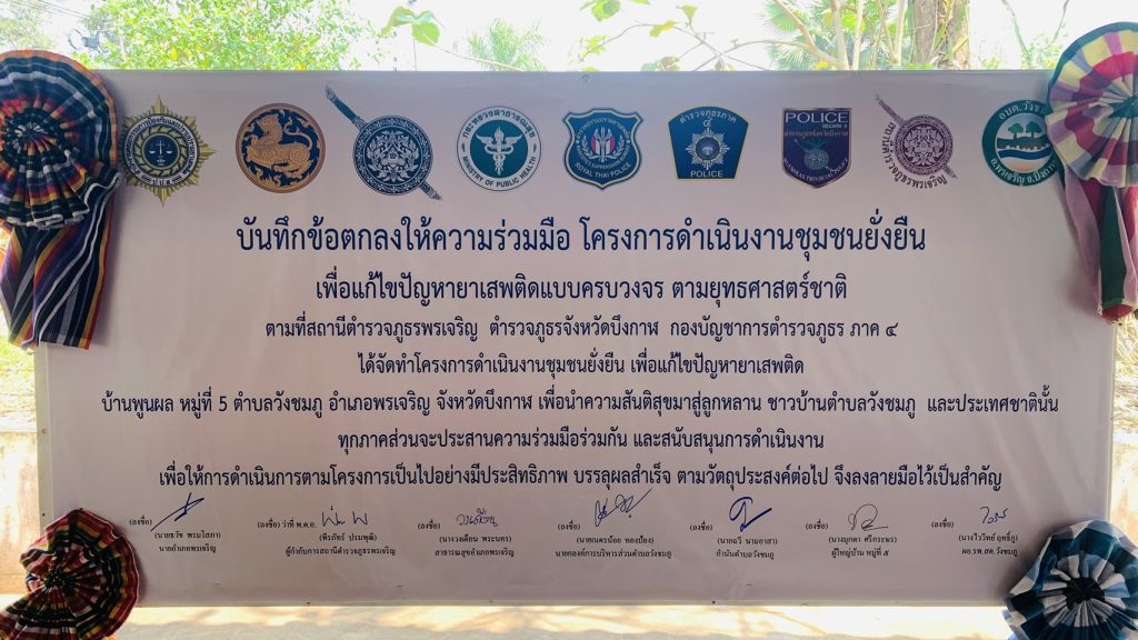 พร้อมชุดปฏิบัติการชุมชนยั่งยืน สภ.พรเจริญ ฝ่ายปกครองอำเภอพรเจริญ สาธารณสุขอำเภอพรเจริญ และองค์กรปกครองส่วนท้องถิ่นในพื้นที่ ร่วมกิจกรรมเปิดโครงการชุมชนยั่งยืนฯ โดยมีนายธวัช พรมโสภา นายอำเภอพรเจริญ เป็นประธานเปิดโครงการชุมชนยั่งยืนฯ พร้อมทั้งร่วมลงนามบันทึกความร่วมมือ (MOU) ณ ศาลาประชาคมบ้านพูนผล ม.5 ต.วังชมภู อ.พรเจริญ จ.บึงกาฬ